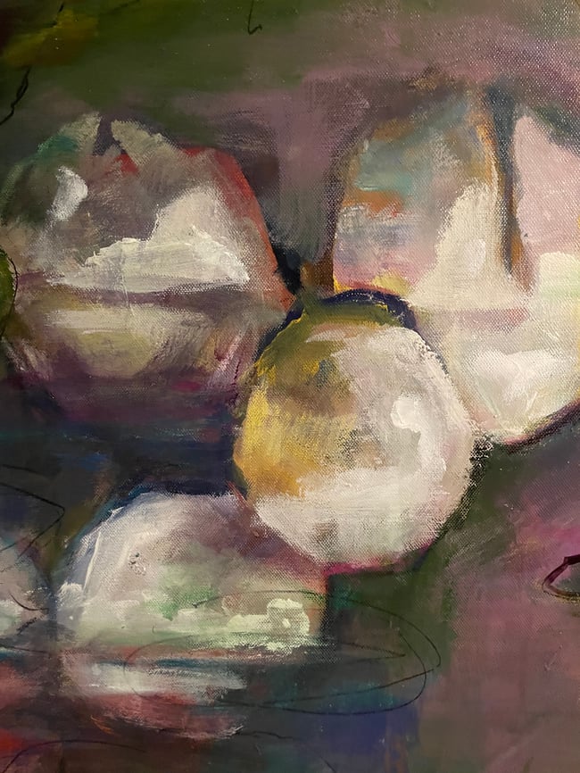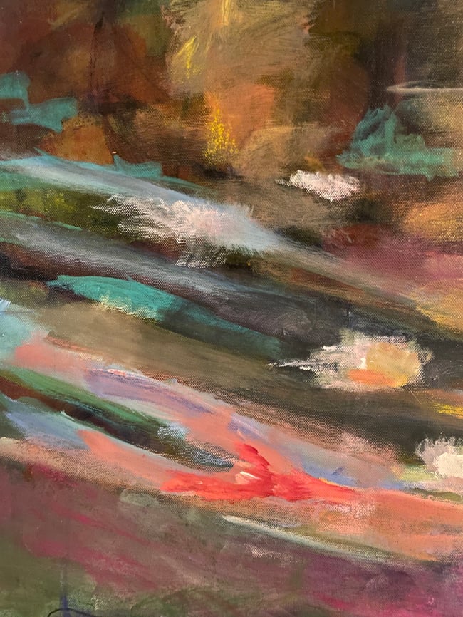 A cool, refreshing sensation of quiet life around a forest pond. Vivid coolness of the water and the rustle of a heron as it takes flight. Oil on canvas. 40 x 30